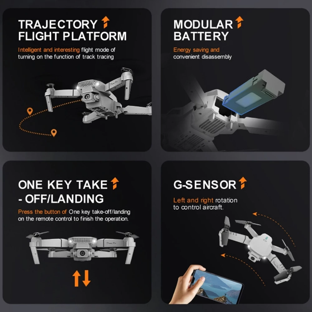 Dual Camera System: Equipped with two HD cameras, usually a main 4K camera for high-resolution footage and a secondary optical flow or downward-facing camera for stable hovering.